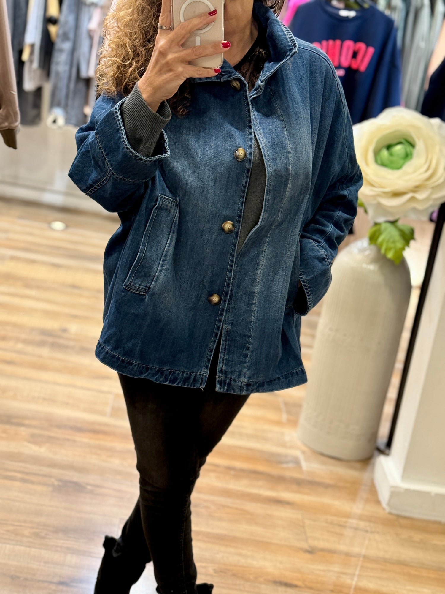 On aime sa coupe oversize ultra confortable, son denim souple et son style facile à associer. Elle se porte aussi bien ouverte que fermée, sur un pull, un tee-shirt ou un top plus habillé pour casser les codes.
