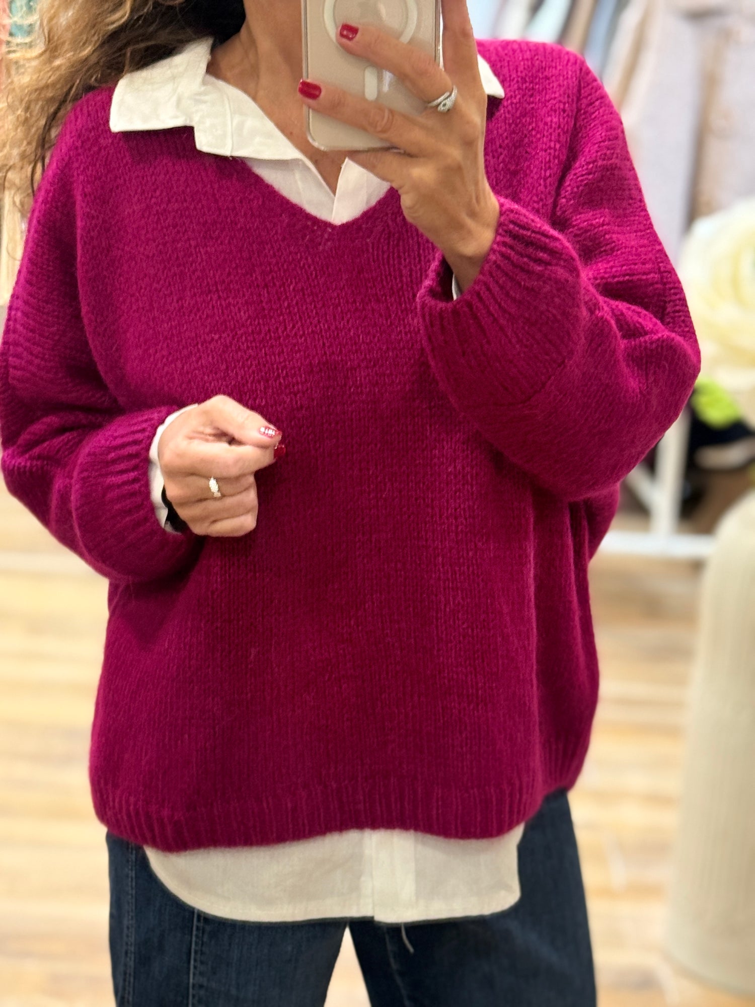 Une maille douce et lumineuse qui apporte immédiatement du style. Ce pull col V fuchsia est la pièce parfaite pour donner du pep’s à vos looks du quotidien. On adore son côté loose confortable, facile à glisser sur une chemise blanche pour créer un joli jeu de superpositions.Sa coupe légèrement oversize offre une allure décontractée mais toujours chic : idéale avec un jean, un pantalon habillé ou même une jupe fluide.