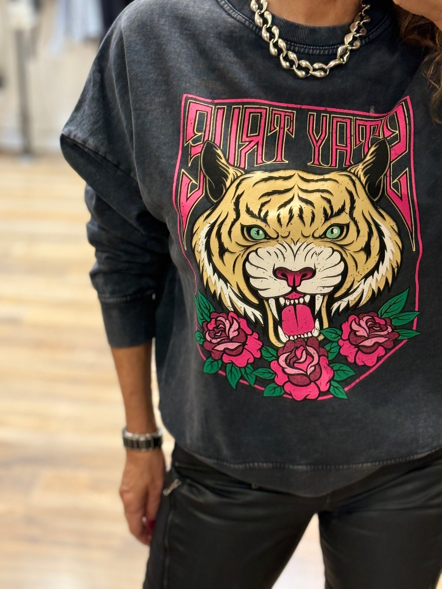 Ce sweat au style affirmé est une véritable déclaration. Son imprimé tigre rugissant entouré de roses apporte une touche rock, audacieuseet ultra tendance. Facile à porter au quotidien, ildonne imédiatement du caractère à une tenue simple.